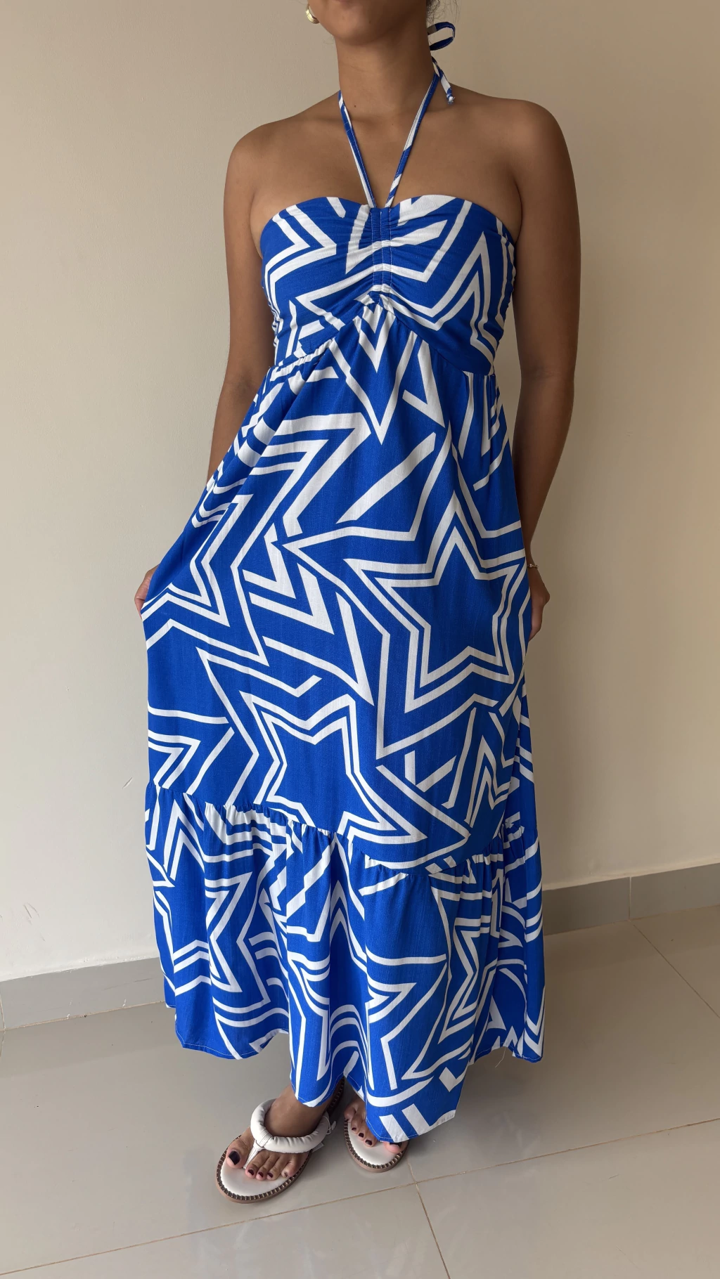 A estampa geométrica de estrelas em azul e branco dá um ar moderno e vibrante à peça, destacando o visual com um toque ousado e sofisticado. O modelo conta com decote tomara que caia com amarração no pescoço e recorte fluido na saia, criando um movimento delicado e feminino. Ideal para momentos descontraídos, passeios à beira-mar ou eventos diurnos que pedem estilo e leveza.